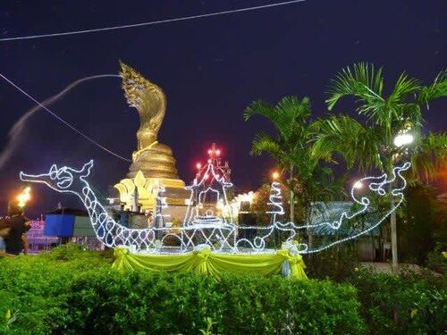2018年3月18日(日)ナコンパノムはナーガ像近傍に 18時33分 電飾を見た。このネオンはタイ王室の御座船を模したものと思う。 以下次号